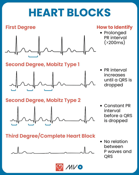 • a) 1st Degree AV Block → In 1st Degree AV Block, the PR interval is prolonged but constant throughout the rhythm, unlike Mobitz I where the PR interval progressively lengthens before a dropped beat. No QRS complexes are dropped in 1st Degree AV Block.