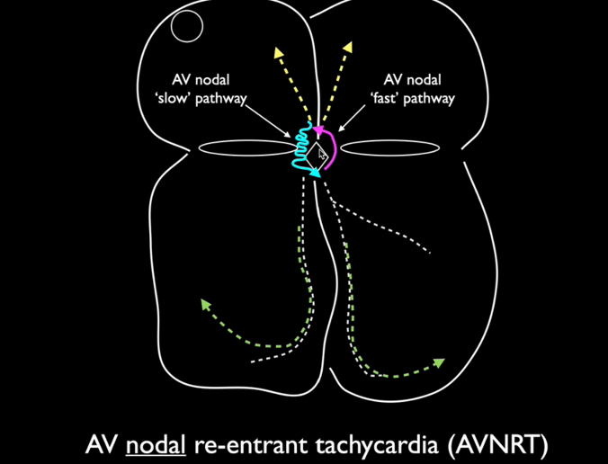 • In AVNRT, there is an abnormal re-entry circuit within the AV node that allows impulses to continuously cycle between a slow and a fast pathway, leading to rapid ventricular activation.