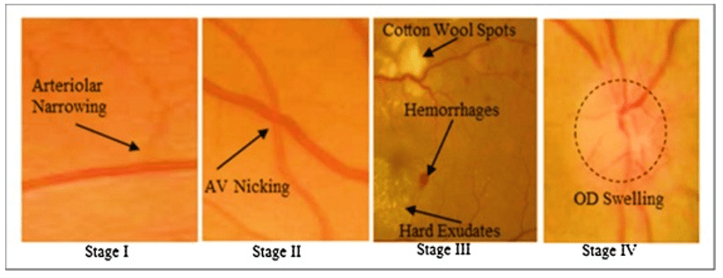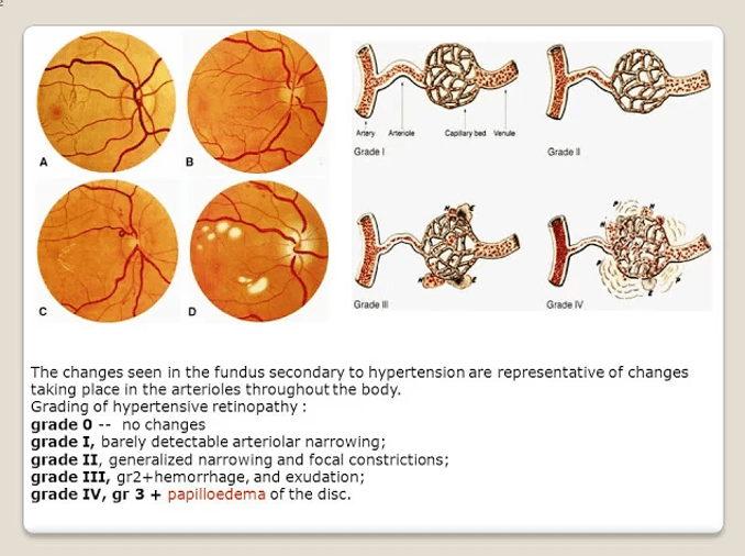 Eyes: Papilledema, retinal haemorrhages, cotton wool spots – typical stage 4 hypertensive retinopathy
