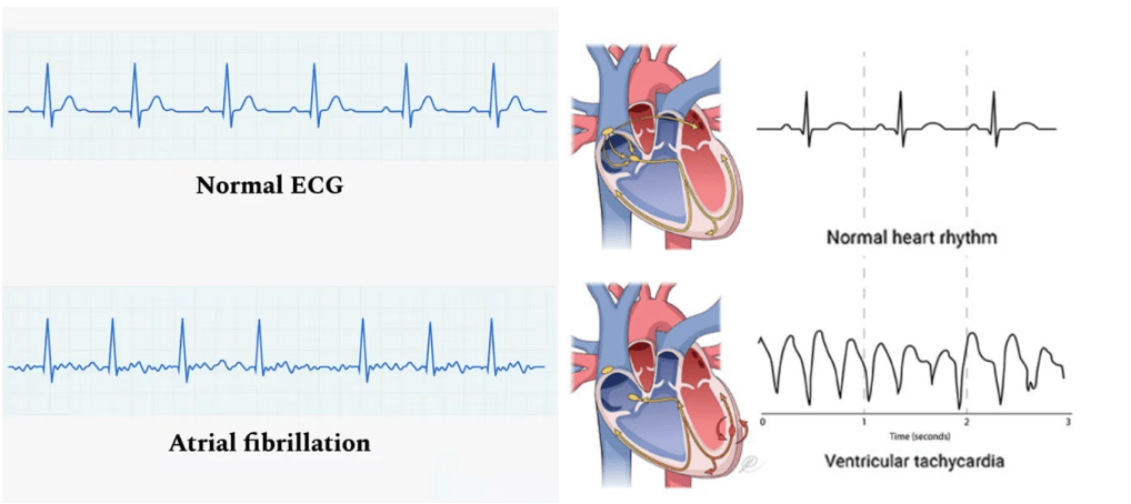 This patient’s symptoms and ECG findings are characteristic of atrial fibrillation (AF), the most common sustained arrhythmia. AF occurs due to multiple ectopic foci, predominantly originating from the pulmonary veins in the left atrium, creating disorganised electrical activity and preventing coordinated atrial contraction.