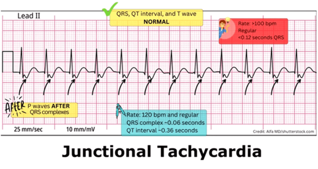 D) is incorrect because Junctional tachycardia which originates near the AV node, results in absent or inverted P waves and a regular rhythm with narrow QRS complexes. Differentiation is based on the presence of consistent rates and inverted P waves.