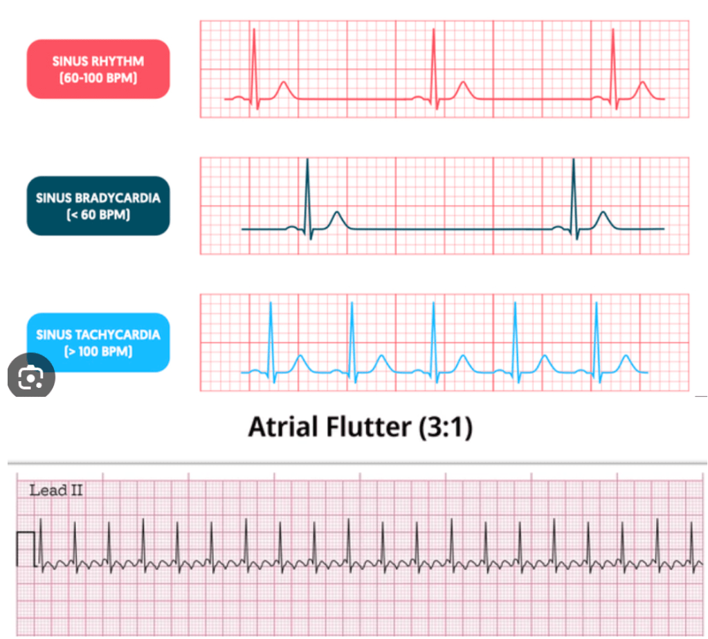 B) is incorrect because Atrial flutter which involves a re-entrant circuit in the right atrium, creates “sawtooth”-shaped flutter waves on ECG, typically seen at a rate of 300 bpm with a 2:1 block leading to a ventricular rate of 150 bpm. Differentiation is based on the regular rhythm and the presence of flutter waves.