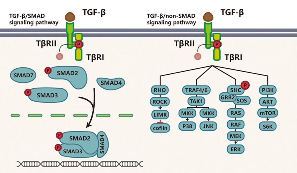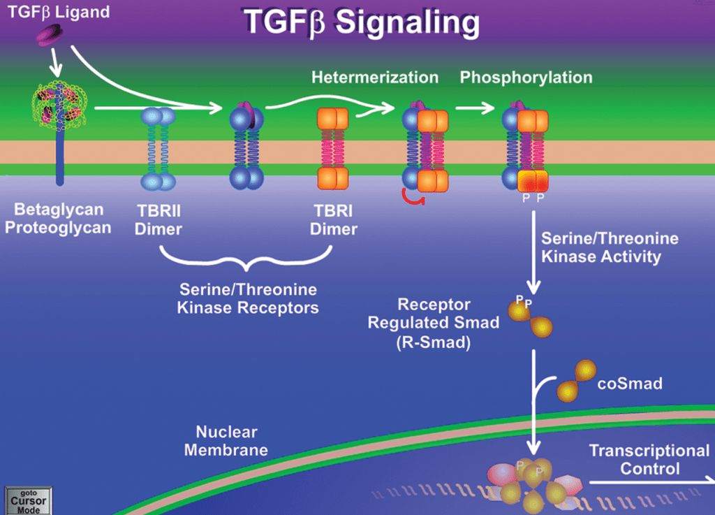 Explanation: TGF-β (Transforming Growth Factor-beta) is a critical regulator of cell growth, differentiation, and apoptosis in epithelial cells. The normal signalling pathway begins when TGF-β binds to its Type II receptor, which recruits and activates the Type I receptor. The activated Type I receptor then phosphorylates Smad2 (and Smad3), which forms a complex with Smad4. This complex translocates to the nucleus, where it regulates the transcription of genes that control cell-cycle arrest and apoptosis, particularly in response to cellular stress or DNA damage.
