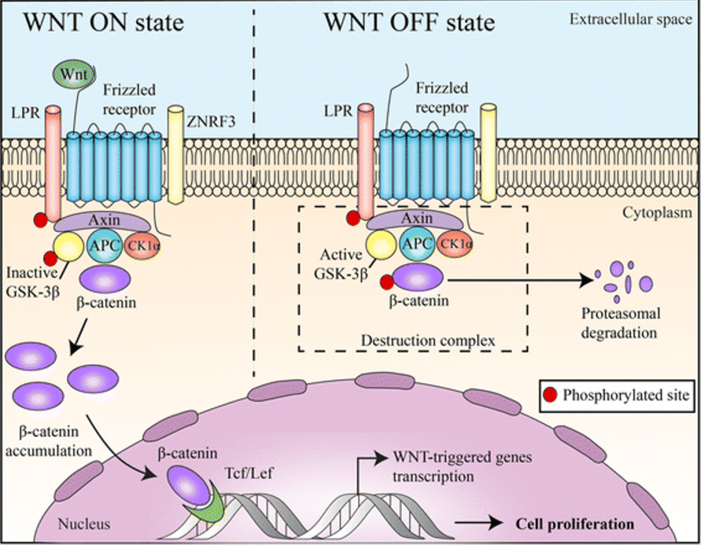 Explanation: Wnt proteins (ligands) are signalling molecules that initiate the pathway. When Wnt binds to its receptor (Frizzled) on the cell membrane, it forms a complex with another co-receptor called LRP (Lipoprotein Receptor-related Protein). The Wnt-Frizzled-LRP complex activates a protein called Dishevelled (Dvl) inside the cell. Dvl becomes phosphorylated and inhibits the destruction complex that normally degrades β-catenin. Under normal conditions (without Wnt signalling), the destruction complex consists of: APC (Adenomatous Polyposis Coli), Axin, GSK-3β (Glycogen Synthase Kinase 3-beta) and CK1 (Casein Kinase 1). This complex phosphorylates β-catenin, marking it for ubiquitination and subsequent proteasomal degradation. When Wnt signalling is active, Dishevelled (Dvl) inhibits GSK-3β and Axin, preventing the destruction complex from functioning. This stops β-catenin from being degraded. Instead, it accumulates in the cytoplasm and then translocates into the nucleus. In the nucleus, β-catenin binds to TCF/LEF (T-cell factor/lymphoid enhancer-binding factor) transcription factors. This activates genes involved in cell proliferation, survival, and differentiation. The target genes activated by β-catenin promote cell division and growth, which is crucial in processes like tissue regeneration. However, dysregulation of this pathway (e.g., mutations in APC or β-catenin) can lead to uncontrolled cell proliferation and cancer, like colorectal cancer.