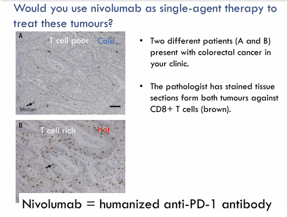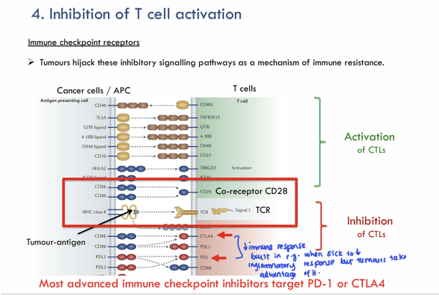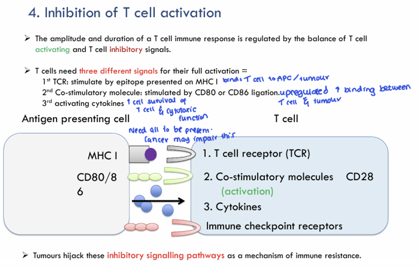Explanation: Tumour infiltrating leukocytes (TIL) are immune cells, such as T cells, B cells, and natural killer (NK) cells, found within the tumour microenvironment (TME). Tumour cells release chemokines (e.g., CXCL9, CXCL10) to recruit immune cells, including TILs, into the TME. Once present, TILs, particularly cytotoxic T cells (CD8+), are inactivated. For example, tumour cells expressing PD-L1 bind PD-1 on T cells, inhibiting their cytotoxic function. In addition, tumours recruit Tregs, which suppress TIL function via IL-10 and TGF-β. This is useful to know clinically as immune checkpoint inhibitors (e.g., anti-PD-1 therapy) aim to restore TIL functionality.