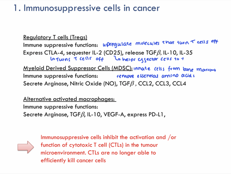 Option A is correct because tumours can recruit immunosuppressive cells like Tregs, MDSCs, and AAMs to suppress CD8+ T-cell activity and promote immune tolerance in the tumour microenvironment. The cells in the tumour microenvironment act in a bidirectional manner. Cancer cells secrete cytokines which influences the type of cells in the TME. Similarly, cells in the TME also secrete cytokines that trigger cancer cell progression & metastasis whilst simultaneously protecting the tumour from the immune response.