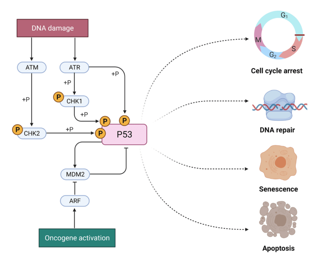 Explanation: P53 is a tumour suppressor protein often called the “guardian of the genome” because it helps maintain genomic stability. When cells experience stress (like DNA damage), p53 is activated and does one of two things: DNA repair: Pauses the cell cycle to allow repair mechanisms to fix damaged DNA and Apoptosis: If damage is irreparable, p53 triggers programmed cell death to prevent the proliferation of abnormal cells. Mutations in the TP53 gene (which codes for p53) are found in over 50% of cancers, leading to uncontrolled cell growth.