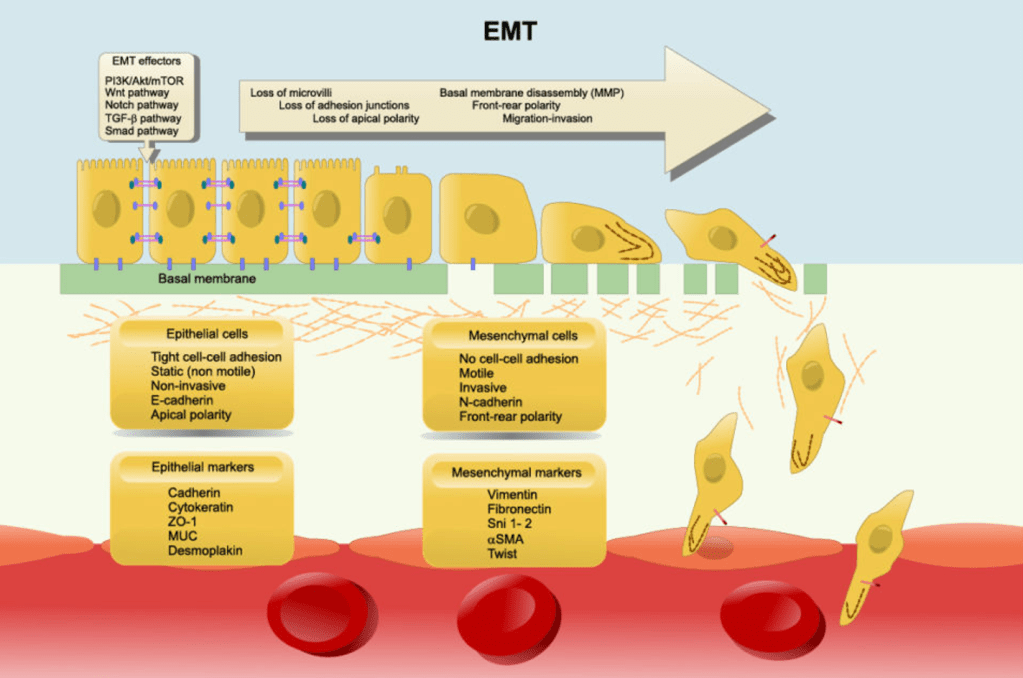 Explanation: EMT is a process where epithelial cells (which are usually organized and have an apical and basal side) transform into mesenchymal cells (which are more mobile and invasive). This transition is crucial for cancer metastasis because it allows cancer cells to detach from the primary tumour and invade other tissues. E-cadherin is a cell adhesion molecule that keeps epithelial cells tightly connected. During EMT, E-cadherin is downregulated, causing the loss of cell-to-cell adhesion. N-cadherin is typically expressed in mesenchymal cells and promotes mobility. Its upregulation helps cancer cells move and invade surrounding tissues. Matrix metalloproteinases (MMPs) are also upregulated in EMT. They help break down the extracellular matrix (ECM), which cancer cells need to pass through to invade new tissues.
