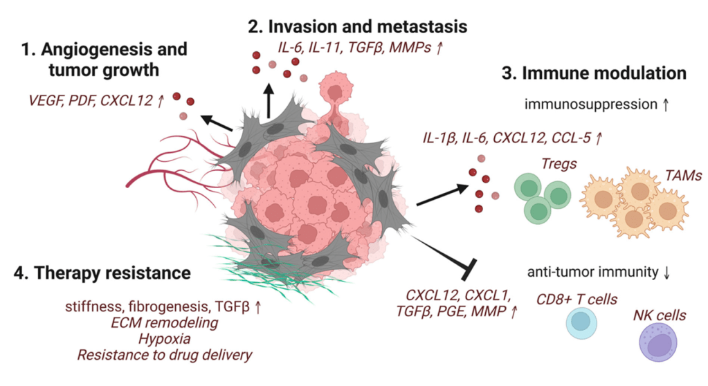 Explanation: Cancer-Associated Fibroblasts (CAFs) play a crucial role in tumour progression by modifying the tumour microenvironment. They contribute to tumour growth and metastasis by secreting cytokines, growth factors, and extracellular matrix (ECM) components, which promote angiogenesis, immune evasion, and drug resistance.