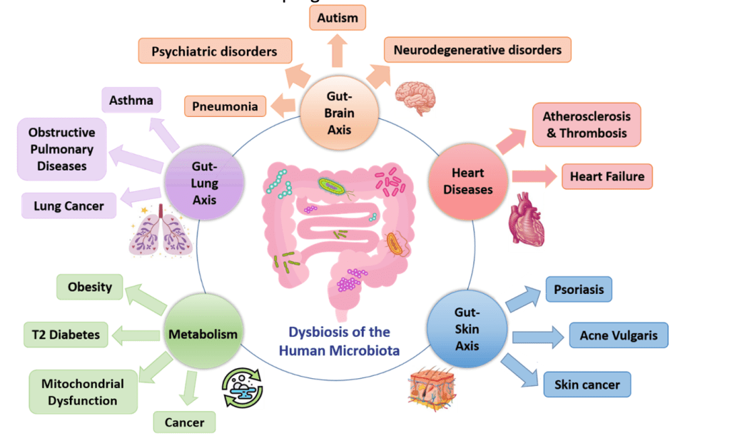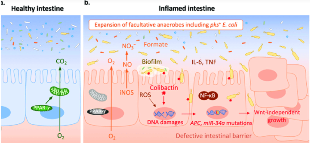 Explanation: Dysbiosis, which is an imbalance in the gut microbiota, often involves a reduction in beneficial bacteria like Bacteroides and Firmicutes, and an increase in potentially harmful bacteria like Proteobacteria, including E. coli. This shift promotes inflammation by activating Toll-like receptors (TLRs) on epithelial cells, which in turn stimulates cellular proliferation. This heightened cellular turnover increases the risk of dysplasia, a precancerous condition, and subsequently colorectal cancer.