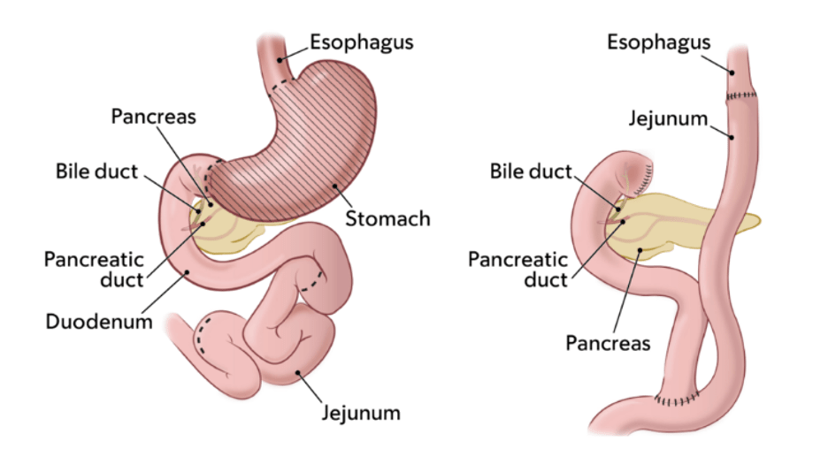 B) is incorrect because a total gastrectomy with oesophagojejunostomy is used for total gastric removal, not partial.