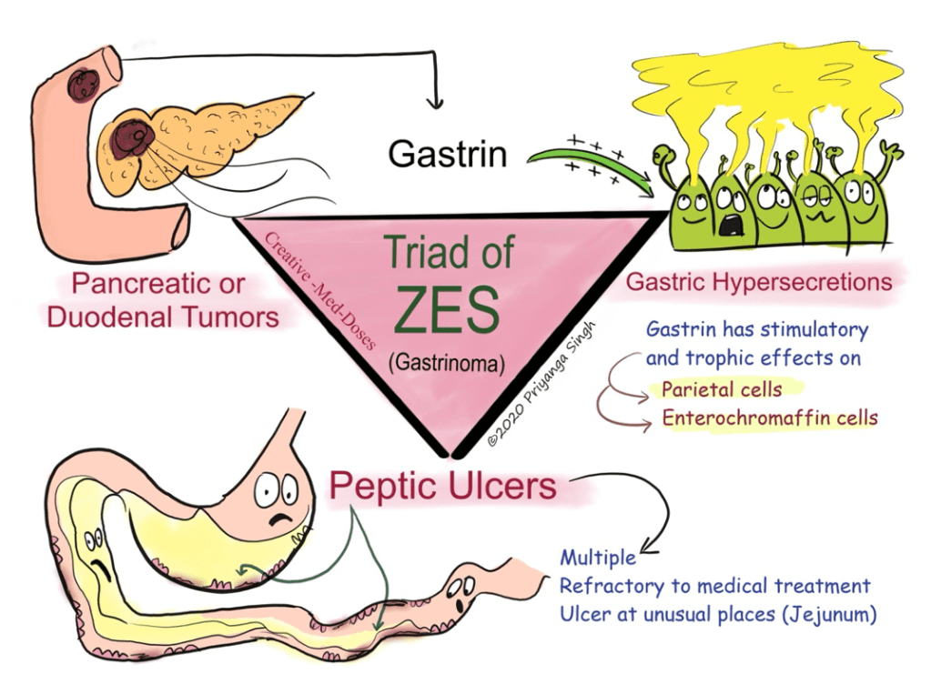 Explanation: This patient’s symptoms, including recurrent peptic ulcers that do not respond to proton pump inhibitors and elevated gastrin levels, are indicative of Zollinger-Ellison syndrome. This condition is caused by a gastrin-secreting neuroendocrine tumour, typically located in the pancreas or duodenum, that leads to excessive gastrin production. Gastrin stimulates the parietal cells in the stomach to produce acid, which causes the formation of multiple ulcers. The excess gastrin production is often a compensatory response to low stomach acid levels.