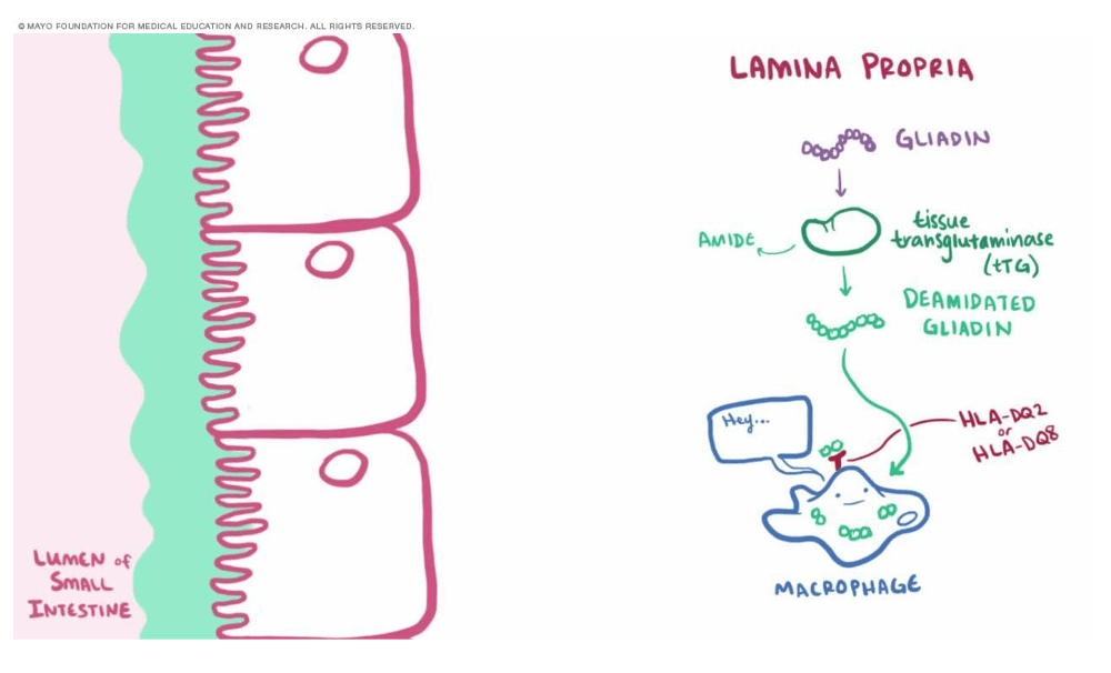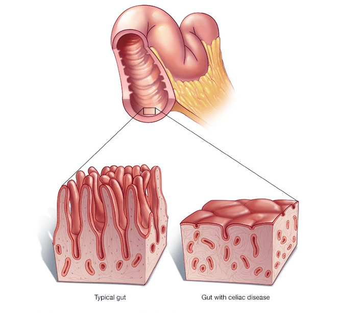 Explanation: Coeliac disease is an autoimmune disorder triggered by the ingestion of gluten, a protein found in wheat, barley, and rye. In genetically predisposed individuals (with HLA-DQ2 or HLA-DQ8 alleles), gluten ingestion leads to an immune-mediated attack on the small intestinal mucosa. Chronic inflammation leads to villous atrophy, crypt hyperplasia, and lymphocytic infiltration in the small intestine. Symptoms of coeliac disease include: diarrhoea, steatorrhea, abdominal pain, bloating. Nutritional deficiencies can also occur and include: iron-deficiency anaemia (most common). Vitamin D deficiency causing rickets in children and osteomalacia in adults. Symptoms with extraintestinal manifestations may occur in some people but not all too including: dermatitis herpetiformis (pruritic rash), fatigue, weight loss and infertility.