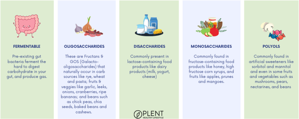 Explanation: FODMAP stands for fermentable oligosaccharides, disaccharides, monosaccharides, and polyols. These are short-chain carbohydrates and sugar alcohols that are poorly absorbed in the small intestine. When FODMAPs reach the colon undigested, gut bacteria ferment them, producing gas. This leads to bloating, abdominal pain, and flatulence (farting). In addition, FODMAPs draw water into the intestine, causing diarrhoea in sensitive individuals. Irritable Bowel Syndrome (IBS) is the most common condition where FODMAP restriction helps.