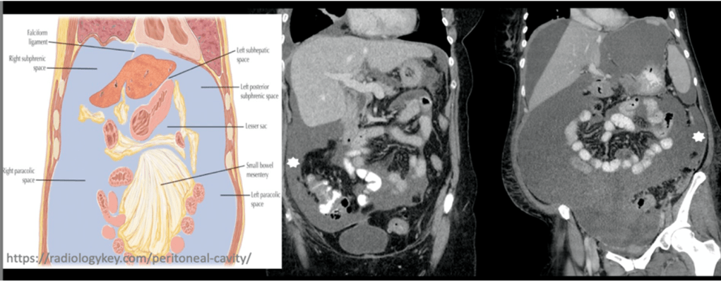 Explanation: Ascites is the pathological accumulation of fluid in the peritoneal cavity. Portal hypertension: Cirrhosis causes fibrosis and scarring of the liver, increasing resistance to blood flow in the portal vein. This leads to elevated hydrostatic pressure in the splanchnic (abdominal) circulation, causing fluid to leak out of blood vessels into the peritoneal cavity. The damaged liver reduces albumin production, which decreases oncotic pressure (the ability of the blood to retain fluid). This allows even more fluid to escape into the peritoneal space. The liver’s lymphatic drainage is overwhelmed, and lymph leaks into the peritoneal cavity.