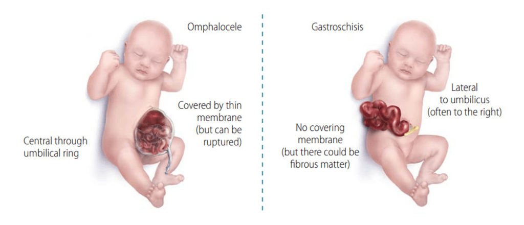 C) is incorrect because an umbilical hernia is a small bulge at the belly button, often present in infants, but it is not a congenital defect of the abdominal wall like gastroschisis.