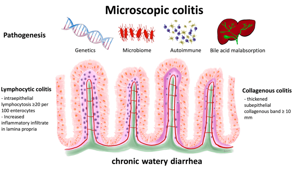 Explanation: Microscopic colitis is an inflammatory condition of the colon that causes chronic watery diarrhoea without visible abnormalities on colonoscopy. It is like Irritable bowel diseases such as Crohn’s and ulcerative colitis but does involves a smaller portion of the colon in comparison to them and there are no systemic symptoms such as weight loss, fever, or anaemia and a normal colonoscopy, distinguishing it from IBD. It is divided into two subtypes: