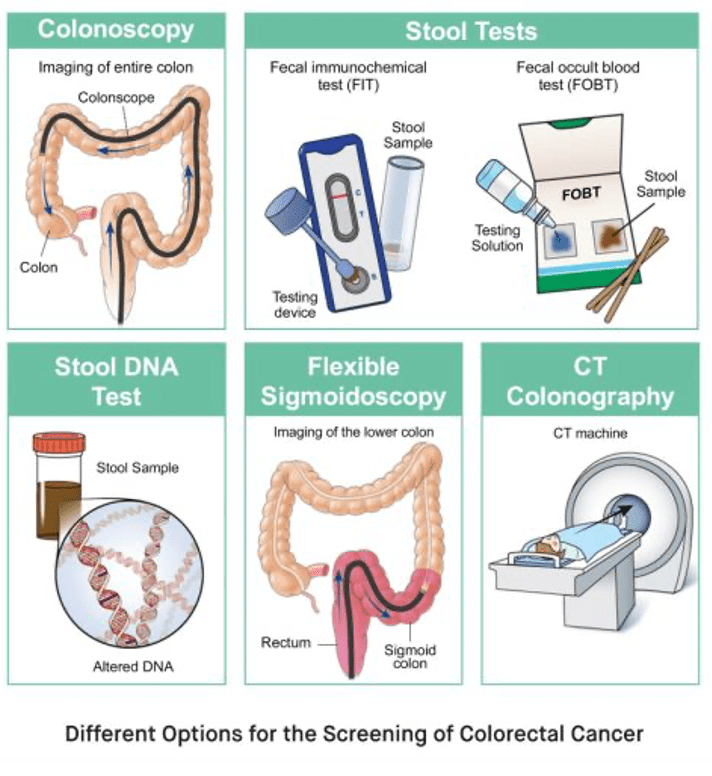Explanation: The faecal occult blood (FOB) test is used in colorectal cancer (CRC) screening to detect hidden blood in stool, which may indicate the presence of colorectal cancer or advanced adenomas. However, the FOB test has relatively poor specificity, meaning it can produce false positives, where blood may be detected in the stool without an underlying malignancy. To improve this, the faecal immunochemical test (FIT) is being adopted in place of the FOB test. The FIT test detects human haemoglobin specifically and has higher specificity for detecting CRC, with fewer false positives compared to FOB.