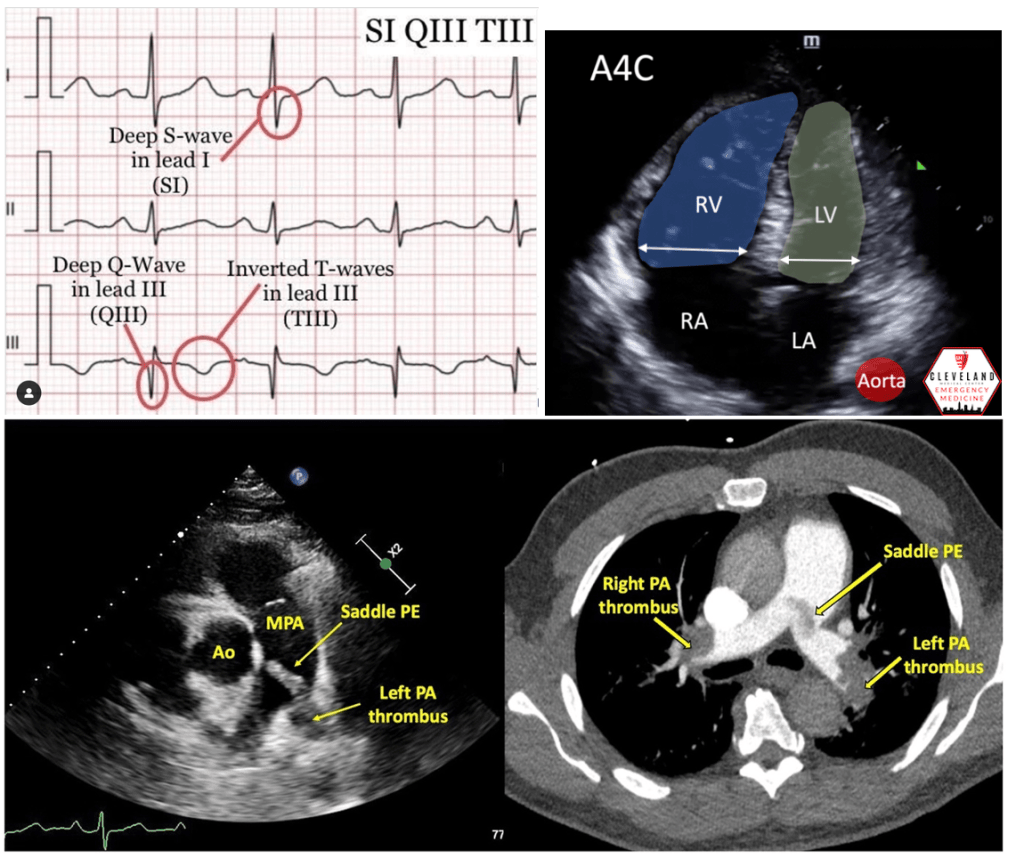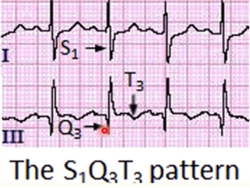 - The S1Q3T3 pattern is classically associated with acute pulmonary embolism. This pattern consists of a deep S wave in lead I, a Q wave in lead III, and an inverted T wave in lead III. It suggests right heart strain due to increased pressure in the pulmonary arteries from a PE. You may also see sinus tachycardia (the heart rate is faster than normal due to the sinus node sending out electrical signals more quickly). You could also find on a PE patient a right bundle branch blocks on an ECG.