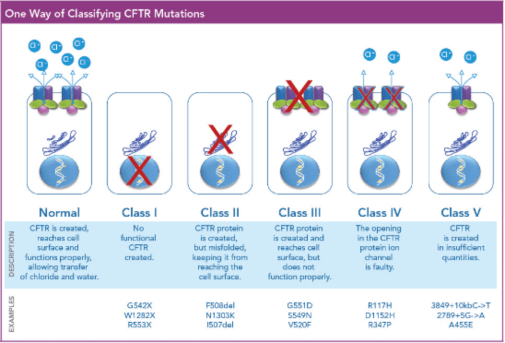 - Option B: Class II: Defective protein processing. Class II mutations, such as the common F508del mutation, produce CFTR protein that is misfolded and degraded before reaching the cell surface.