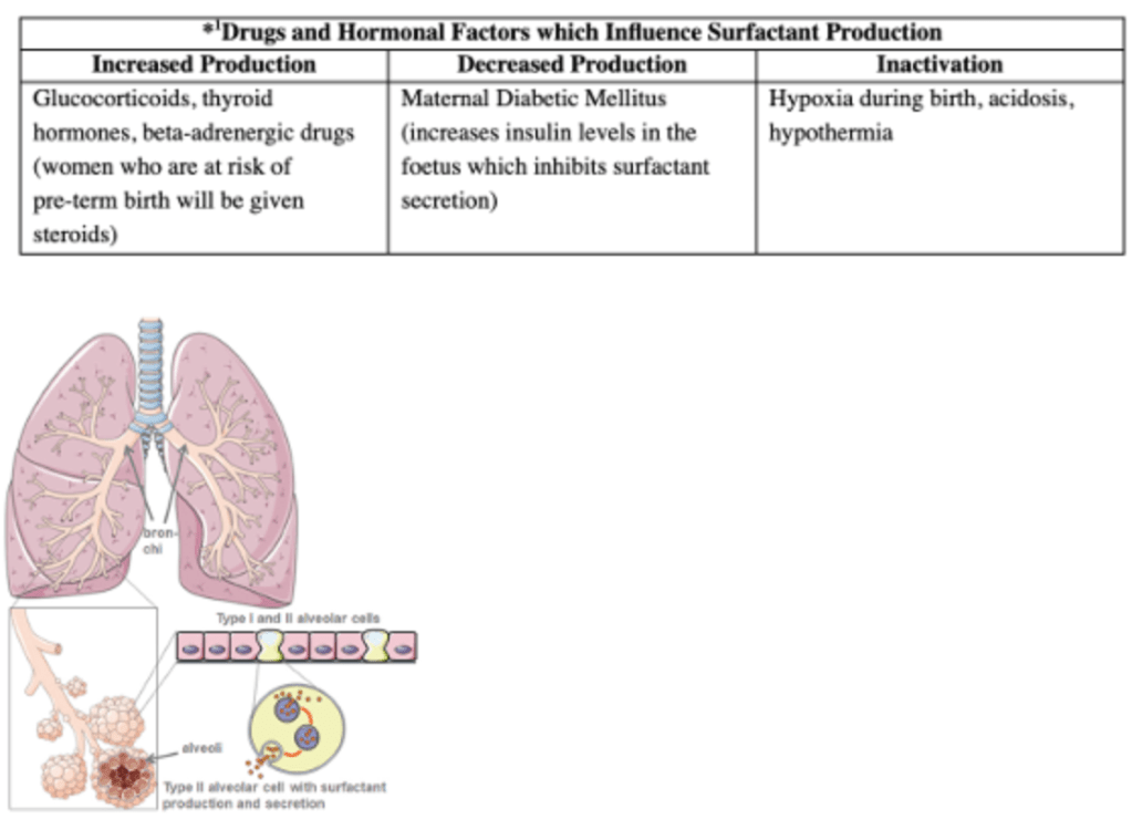 Explanation: Neonatal respiratory distress syndrome (RDS) is primarily due to surfactant deficiency. Surfactant is crucial for reducing alveolar surface tension, allowing the lungs to expand and preventing alveolar collapse (atelectasis). Surfactants are produced by Type II pneumocytes in the lungs, they contain phospholipids and surfactant proteins (SP) such as SP-A and SP-D which are involved in immune defence, helping clear pathogens and regulate surfactant balance, SP-B and SP-C which are essential for adsorption and spreading of surfactant on alveolar surfaces.