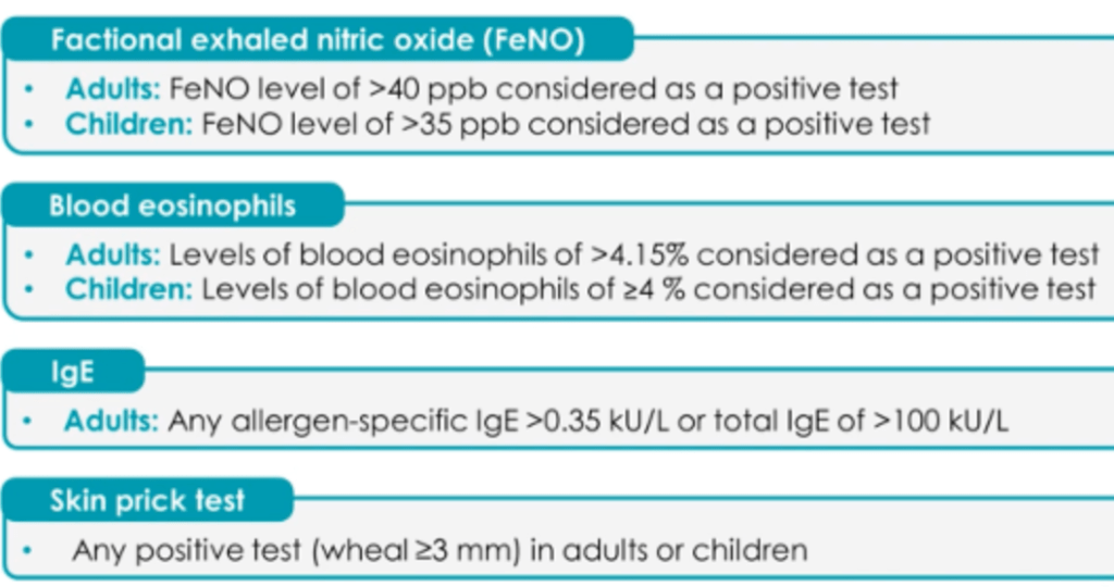 Explanation: FeNO is a non-invasive biomarker used to measure airway inflammation, specifically eosinophilic inflammation, in asthma patients. Nitric oxide (NO) is produced by airway epithelial cells in response to inflammation. Elevated FeNO levels indicate increased activity of eosinophils in response to IL-4, IL-5 and IL-13. It helps diagnose asthma and assess corticosteroid responsiveness, usually patients with asthma have high levels of eosinophils before onset of symptoms (since they are variable) if corticosteroids are given prior to symptoms (when FeNO) levels are elevated, the asthma would be more responsive to the medications.