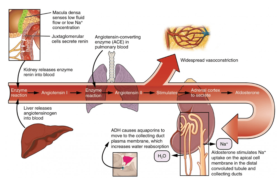 *Explanation: The juxtaglomerular apparatus plays a crucial role in regulating blood pressure by secreting renin in response to changes in blood pressure or sodium levels, detected by Macula densa cells. When levels of sodium chloride in the distal convoluted tubule are low, it indicates that the GFR is low which can be due to low blood pressure, hence the Juxtaglomerular apparatus/cells release renin which promotes systemic vasoconstriction to increase blood pressure, the release of angiotensin from the adrenal glands, as this stimulates more sodium reabsorption from DCT and collecting ducts causing water to move in by osmosis which increases blood volume and hence blood pressure, it also stimulates the release of ADH (vasopressin) from the posterior pituitary which stimulates the formation of aquaporins in the collecting ducts, causing more water to be absorbed, increasing the volume of blood and therefore blood pressure.*