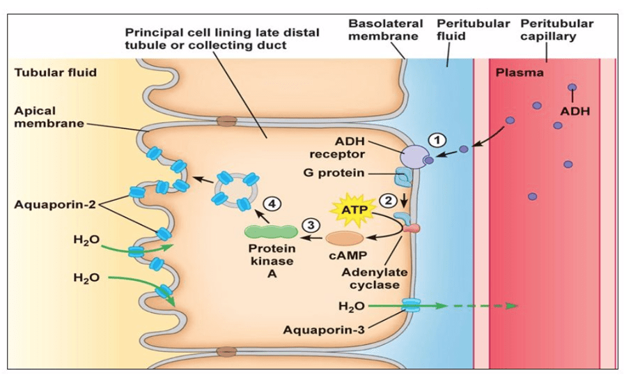 Explanation: Vasopressin, also known as antidiuretic hormone (ADH), plays a crucial role in regulating water balance in the body. It is released in response to signals such as increased blood osmolality (concentration) or decreased blood volume. One of its primary actions is to increase water reabsorption in the kidneys, primarily in the collecting ducts. Vasopressin achieves this by upregulating the expression of aquaporin channels (Aquaporin 2 on the apical side and Aquaporin 3 on the basolateral side) in the cells lining the collecting ducts. Aquaporins are water channels that facilitate the movement of water across cell membranes. By increasing the number of aquaporin channels, vasopressin enhances the permeability of the collecting ducts to water, allowing for more efficient reabsorption of water from the urine back into the bloodstream. This mechanism helps to conserve water and concentrate urine, thereby maintaining proper fluid balance in the body.