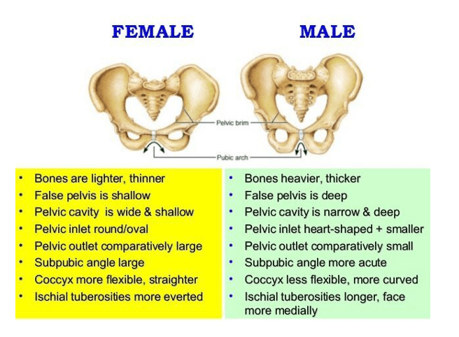Explanation: The female pelvic inlet is broader and more circular to accommodate childbirth, whereas the male pelvic inlet is narrower and more heart-shaped.