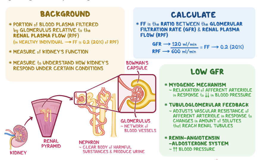 Explanation: Filtration Fraction (FF) is calculated as GFR divided by RPF, representing the proportion of plasma that is filtered.