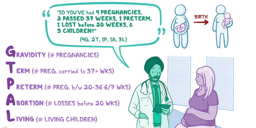 Explanation: Gravidity 4 (total number of pregnancies, including the current one) and Parity 2 (number of pregnancies that are past 20 weeks regardless of whether of the outcome). She is currently pregnant, making her gravidity 4, and her parity is 2 due to the two full-term deliveries- have gone past 20 weeks.