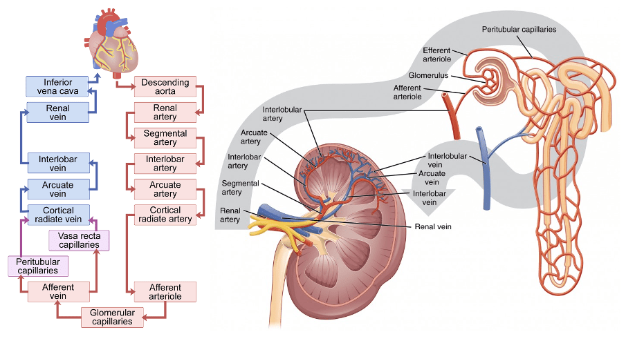 D is incorrect as the efferent arteriole carries blood away from the glomerulus after filtration has occurred and supplies it to either the peritubular capillaries in the cortex or the vasa recta in the medulla. It does not carry blood into the renal cortex from the renal artery. Mnemonic for arteries and veins of the kidneys.