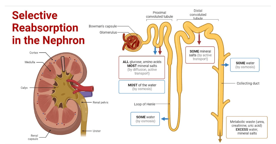 B is incorrect as reabsorption of glucose mainly occurs in the proximal convoluted tubule not in the collecting ducts.