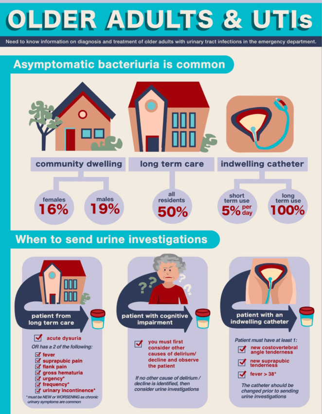 Explanation: A decrease in body temperature by 1.5º is not typically used as a clinical sign for diagnosing urinary tract infections (UTIs) in elderly individuals. Infections generally cause fever (increased temperature), but in elderly patients, the signs can sometimes be atypical, and they may present with hypothermia rather than hyperthermia. However, a specific decrease in temperature by 1.5º is not a recognised diagnostic marker for UTIs, instead old people tend to have a 1.5º increase in temperature.