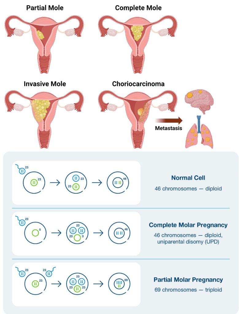 - Incorrect: The “snowstorm” pattern is characteristic of a complete hydatidiform mole (a form of GTD), not GTN. In GTD, the ultrasound may show a heterogeneous mass or vesicular pattern (incomplete mole) or the classic “snowstorm” appearance (complete mole). GTN typically presents with a mass or irregular mass in the uterus, but it does not have a “snowstorm” pattern; rather, it shows evidence of invasive disease.