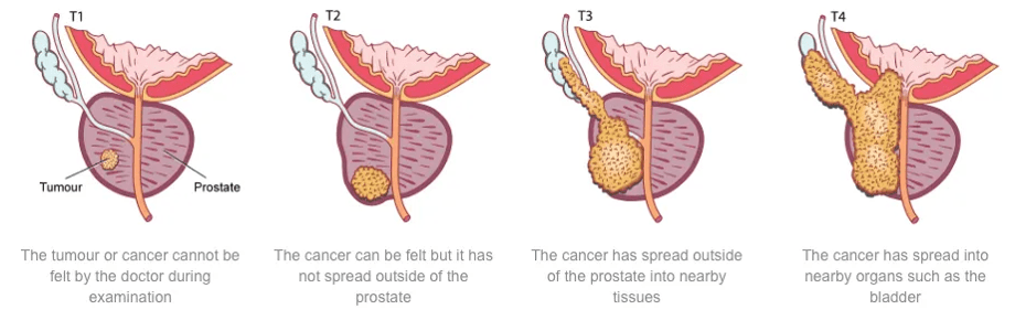 Explanation: Most prostate cancers are diagnosed at stage T1c due to widespread use of prostate-specific antigen (PSA) testing in routine screenings. T1c refers to prostate cancers that are not palpable on digital rectal examination (DRE) and are not visible by imaging but are detected due to elevated PSA levels. This stage is common because PSA screening often identifies prostate cancer before symptoms appear or the tumour can be physically detected.