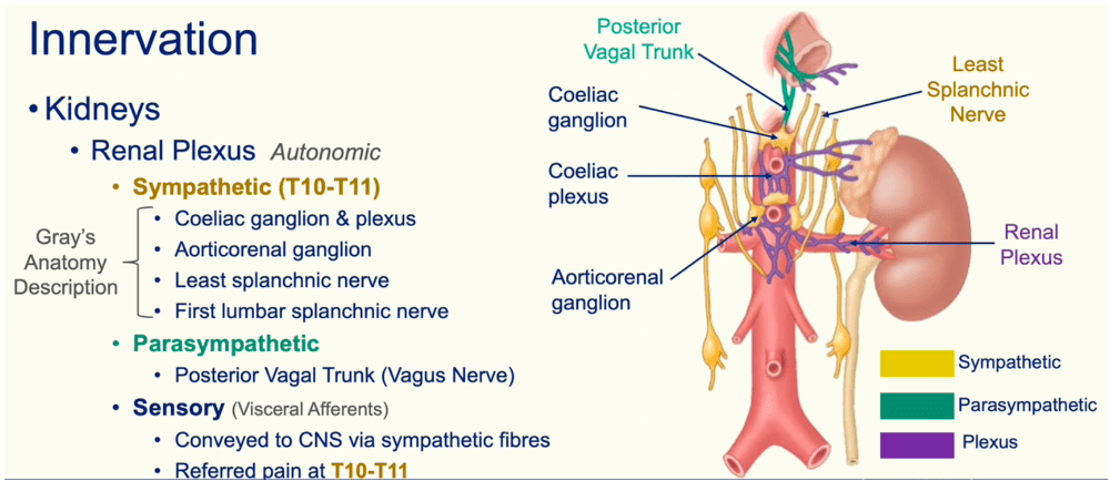 Explanation: The kidneys receive sympathetic innervation primarily from the coeliac ganglion and plexus, the aorticorenal ganglion, the least splanchnic nerve, and the first lumbar splanchnic nerve. These nerves provide sympathetic input, which affects blood flow, filtration, and renal tubular function.