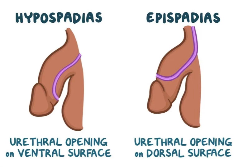 - Incorrect: Hypospadias is a congenital defect where the urethral opening is located on the ventral (underside) of the penis, often along the shaft or at the base. This is the opposite of epispadias, where the opening is on the dorsal (top) side of the penis.it also presents with a lack of ventral curvature.